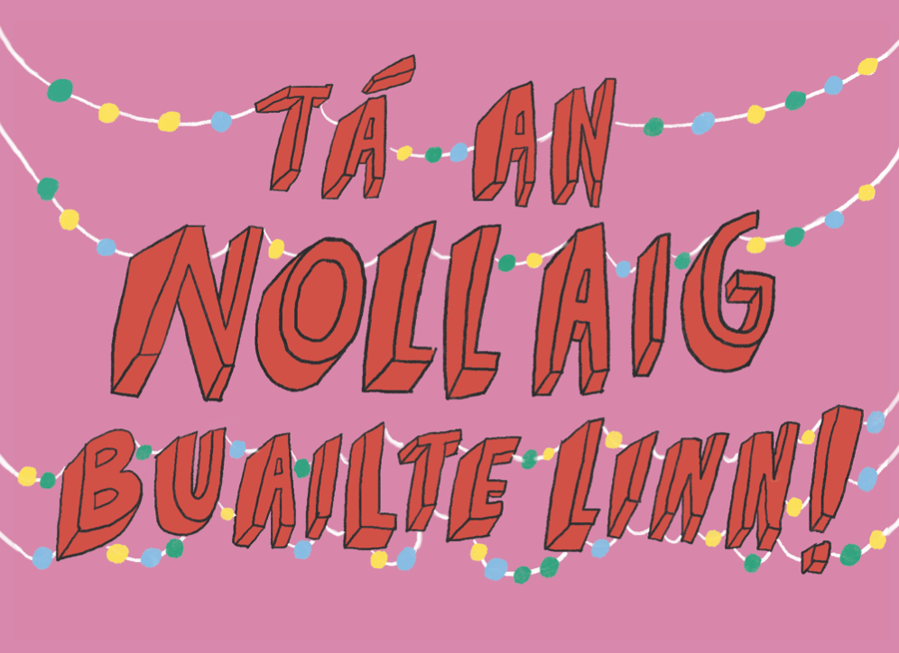 ‘Christmas is upon us!’A6 greeting card printed on 300gsm recycled card. Packaged in a compostable cellophane bag with matching envelope. Translated to English on the reverse, making Irish accessible.